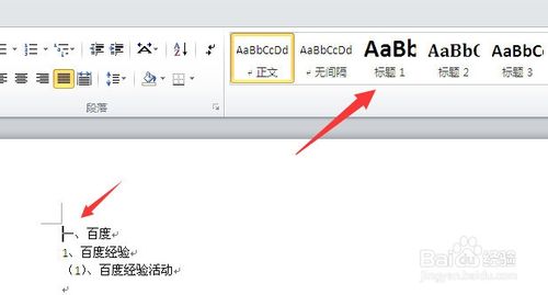 1、首先在自动生成目录之前,现在word文档页面中,把输入符放在一级标题上面,然后在“开始”菜单下顶部目录索引框中点击“标题1”。(如下图)