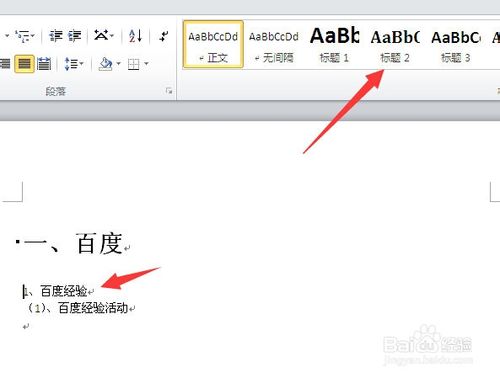 2、接着再把输入符放到二级标题上面,再点击顶部目录索引框中的“标题2”。(如下图)