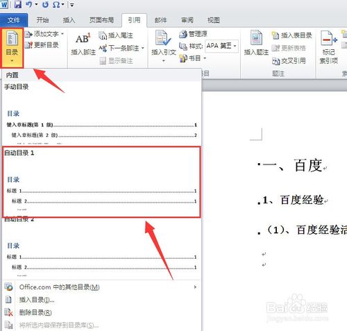 5、在“引用”菜单下的工具栏中,点击左侧的“目录”工具,在弹出来的选项菜单中,点击“自动目录1”或者“自动目录2”。(如下图)