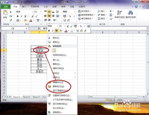 5、当你发现你的批注不完整或批注错误需要修改的时候,你可以再次选定该单元格或文学,点击右键,在右键菜单中选择“编辑批注”或“删除批注”或:显示/隐藏批注“,重新设置即可。