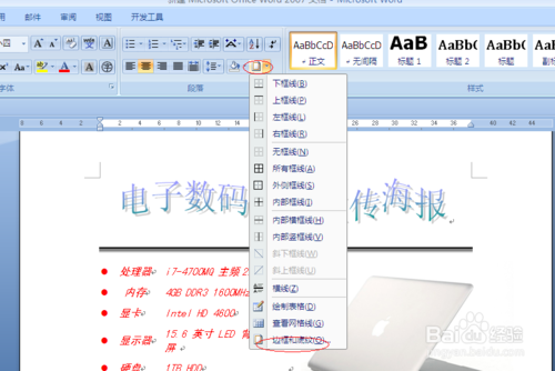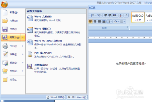 1、输入海报的内容。今天制作一个电子产品的宣传海报。新建一个空白文档,输入“电子数码产品宣传海报”,单击开始--段落-居中,我们首先设置好标题,并保存好。单击office按钮,选择“另存为”单击想要保存的格式和位置