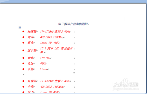 3、设置海报内容格式。内容需要完之后需要设置字体及段落格式,时期美观得体。标题我们设置成楷体,四号,蓝色。之后我们设置下面的文本,选中下面的文本,单击“开始”“段落”“项目符号”,将文本字体设置成黑体,红色,倾斜。