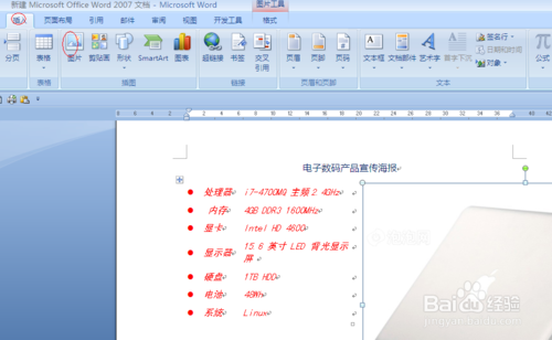 4、设置好文本后,我们准备插入图片。单击“插入”插图里面“图片”弹出对话框后,选择我们准备的好的图片。这会可能引文图片大小等原因会影响到文本格式,我们稍后再调整。同样我们在插入其他产品的图片,以此类推