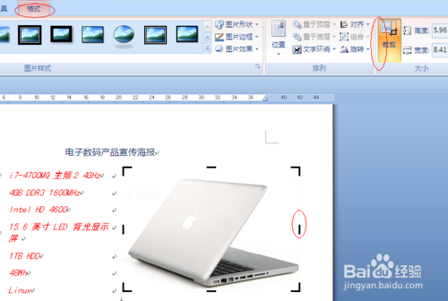 5、我们设置图片的格式。图片插入后,往往不符合要求,根据具体情况进行格式调整;首先设置图片的大小,图片周围可能很多空白区域,我们单击“格式”选择大小里面的“裁剪”按钮。剪掉四周空白区域,同样方法剪掉其他图片周围区域。