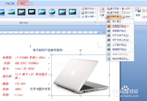6、这一步我们设置文字与图片的关系。选中第一幅图,单击“格式”选择排列里面的“文字环绕”,从弹出的下拉菜单中选择“四周环绕”,按照同样方法设置其他图片。设置好,我们把图片拖动到合适的位置,图片与左侧文字对齐。