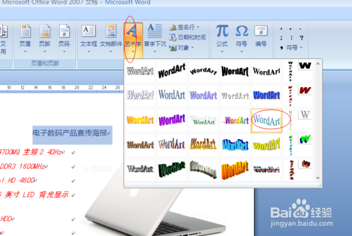 7、为了是得海报更加美观,我们吧标题设置为艺术字。选中标题,单击“插入”选择文本里面的“艺术字按钮”,我们这里选择样式17,弹出对话框后,里面的文字应该是标题,直接点击确定。