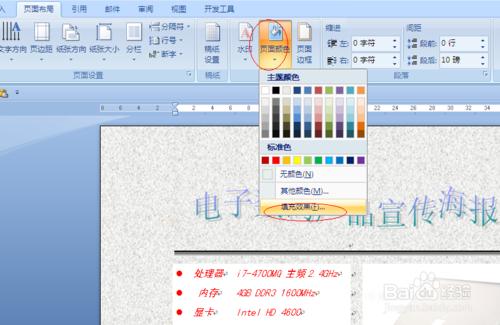 9、我们现在做最后的调整。我们把图片调整相适应的大小。我们在做个页面背景,单击“页面布局”选择页面背景里面的页面颜色,从弹出的对话框中选择“填充效果”命令,之后单击“纹理”选项,根据喜爱选择。