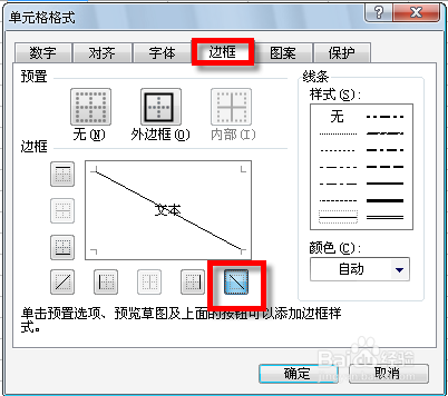 2、在“单元格格式”对话框中,找到“边框”选项卡,点击下方的斜线按钮,添加斜线。确定后退出看看,刚才选定的单元格已经添加了斜线。
