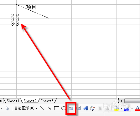 4、点击“横排文本框”,插入两个文本框,分别输入表头文字,比如“时间”和“项目”两项。调整好位置和大小。本例中为了方便说明,将表头宽高设置的比较大。