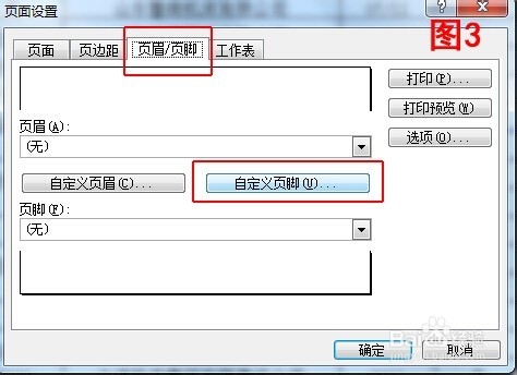 然后进入页面设置对话框,选择“页眉/页脚”项目栏,然后点击“自定义页脚”,如图3所示。