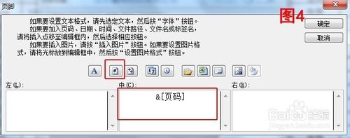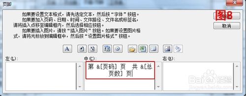 在页脚设置对话框中,我们能够看到左、中、右三个框框,意思是位置;在这里我们选择中,然后点击如图4所示的“页码”按钮,然后点击确定。其他几个按钮自己可以点击试试,有总页数,有日期等等。