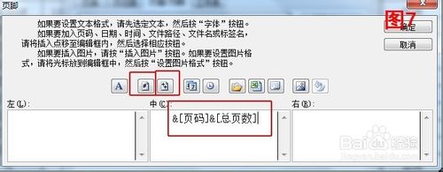 有的朋友要出难题儿了:我如果想要第 X 页,共 X 页的效果该如何实现捏?完全是可以的,咱们还回到自定义页脚对话框处,分别点击页码、总页码按钮,产生如图7所示的效果。