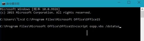2、打开命令提示符,用cd 命令行进入Office 2013的目录,以上述目录为例,输入:cd C:\Program Files\Microsoft Office\Office15 回车,继续输入:cscript ospp.vbs /dstatus 回车