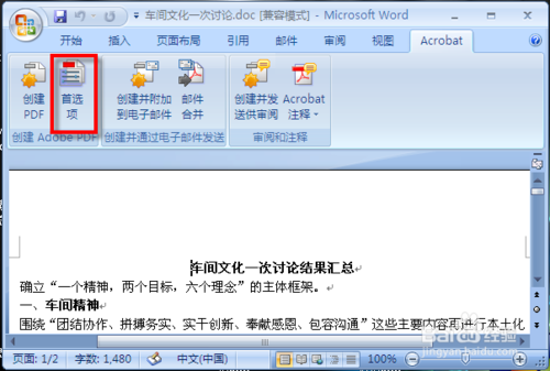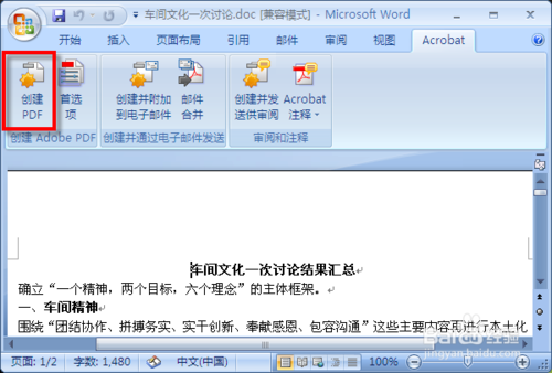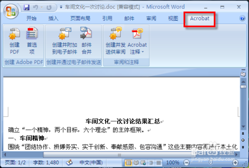 2、AdobeAcrobat9安装完成后,打开一个word文档。可以看到工具栏多出了一个Acrobat标签,打开后有几个按钮。
