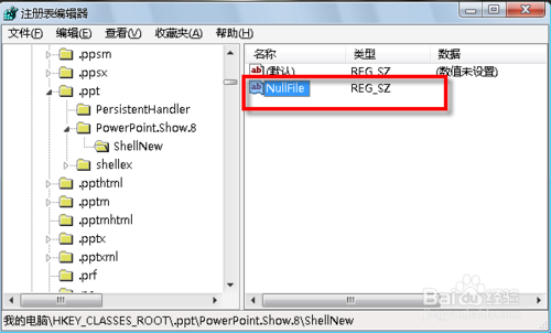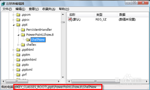 3、在注册表编辑器中定位到“HKEY_CLASSES_ROOT\.ppt\PowerPoint.Show.8\ShellNew”。