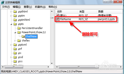 6、如果只想保留新建97-2003 PowerPoint文档,那么可以在注册表中定位到“HKEY_CLASSES_ROOT\.pptx\PowerPoint.Show.12\ShellNew”,将右侧的“FileName”删除即可。