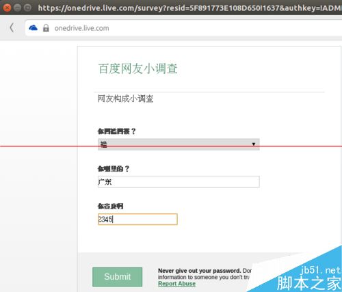 本步骤用另一个浏览器,在不登录的情况下打开第 5 步骤中生成的调查共享链接,并答卷、提交,非常顺利。