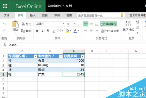 注:在问卷设计完成后,Excel Online 自动生成了一个以问卷问题为标题栏的表格,等待问卷结果的传来。
