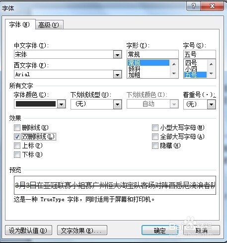 3、在“字体”选项卡中钩中“双删除线”复选框。然后点击“确定”。