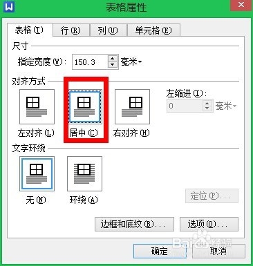 8、首先在”表格属性“控制面板中,我们将”对齐方式“选择为”居中“,这样看起来更加整齐,当然,你如果有其他的需求,”对齐方式“可以根据实际需要来选择和设置。