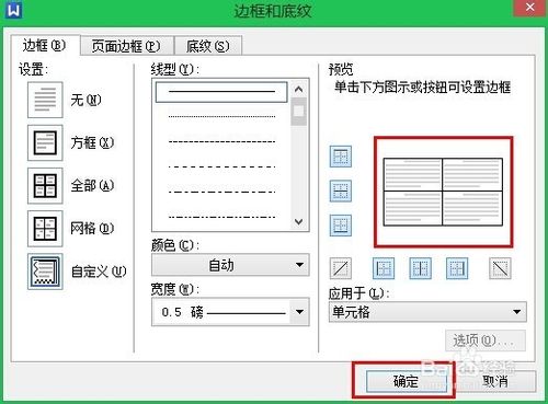 10、然后,在”表格属性“控制面板中选择下方的”边框和底纹“,在”边框和底纹“控制面板中,我们选择”边框“。边框设置为”无“,然后将”预览“侧的”上中下“和”左中右“六条线段选上。下方的”应用于“,选择”单元格“。最后单击确定。如下图所示。