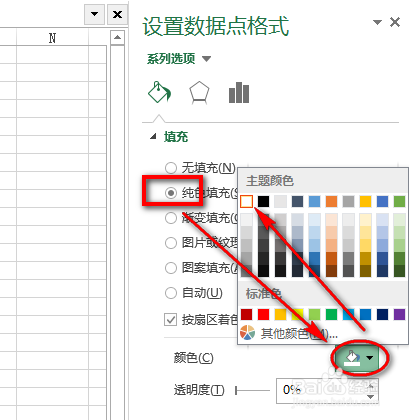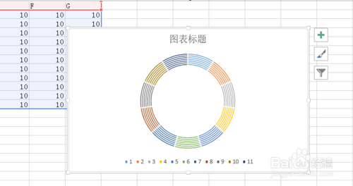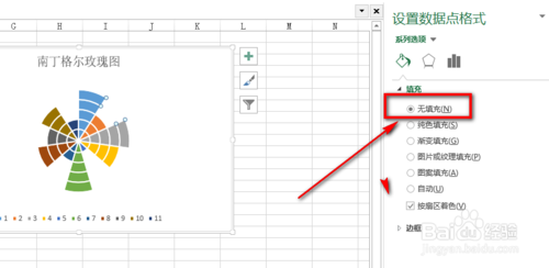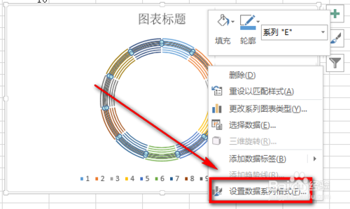 5、接下来是重点,我们利用颜色填充来做所要做的图表,我们点击圆环,然后双击某一个单独的环——右键——设置数据系列格式(或者直接选择填充)——选择无填充或者纯色填充为白色,这样一个一个做实在是太慢,那么我们就要善于运用F4键,这样会事半功倍