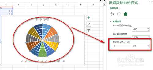 4、接下来我们右键图表——设置数据系列格式,在右侧窗口中将圆环内径大小调为3%左右,其结果如下图