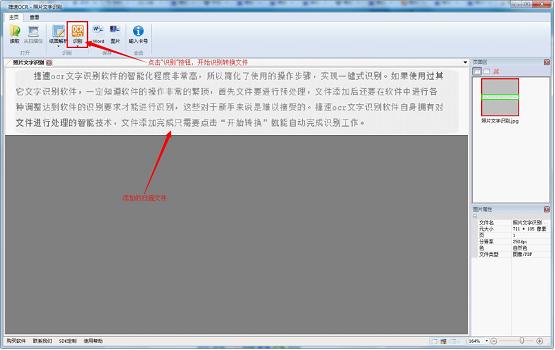 第三步,文件添加完成,大家可以识别整个文件,也可以直接选取一部分文件内容。用户可以点击“识别”按钮对选取的文件内容进行识别,软件界面右侧就会显示该内容所识别出来的文字。