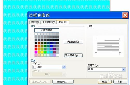 6、再按“Ctrl+A”全选文字,点击“格式”“边框和底纹”在弹出的对话框中点击“底纹”“填充”选择“无填充颜色”确定,