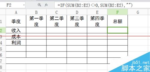 6、细心的朋友,可能会通上面几张图看出F2中的公式和最初图中显示的公式不同。图中有0时,F2的公式是=SUM(B1:E2),而图中无0时,F2的公式却是=IF(SUM(B2:E2)<>0,SUM(B2:E2),""),那么公式=IF(SUM(B2:E2)<>0,SUM(B2:E2),"")有什么含义呢?