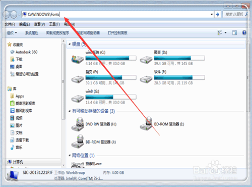 4、复制“C:\WINDOWS\Fonts”,粘贴到该地址栏,点击“回车键”。