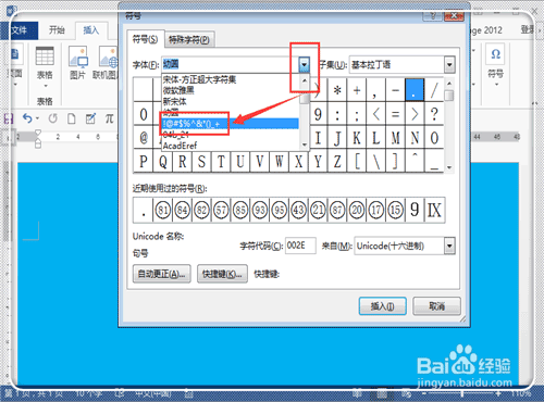 4、在“字体”后面,下拉倒三角形,找到这个乱码的名字,点击他。