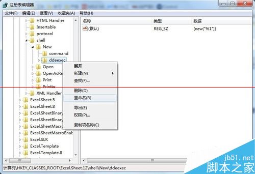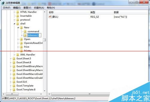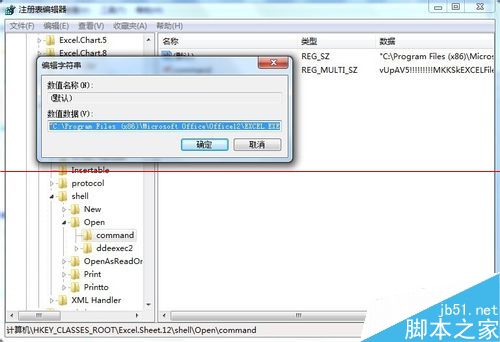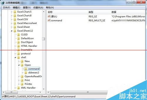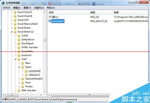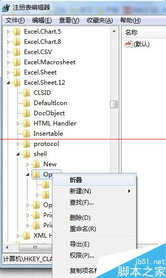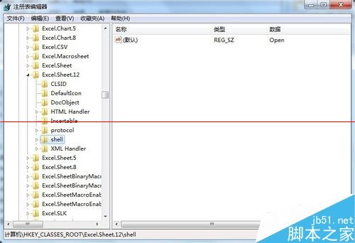 4、找到 Excel.Sheet.12\shell\Open,修改内容前应先对注册表进行导出备份