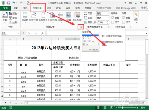 2、点击“页面布局”,点击这个符号,然后点击“页面设置”。