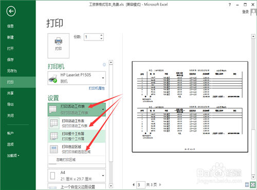 9、看到打印预览,这里还可以进行各种设置,比如是打印工作表还是打印工作簿还是打印选中的区域等等,自己挑喜欢的,选中,点击“打印”就可以打印。