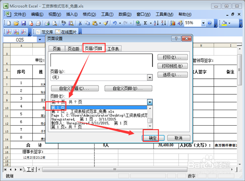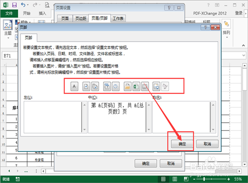 7、这里有各种页脚设置,点击这些图标,查看是否是自己喜欢的。然后点击“确定”。