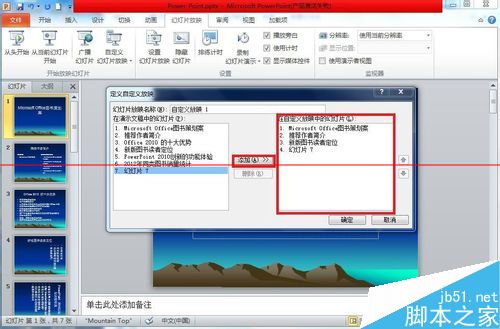 4、单击“新建”按钮,弹出“定义自定义放映”对话框,讲希望放映顺序的幻灯片添加到“在自定义放映中的幻灯片”列表框中。