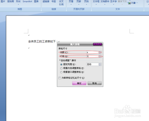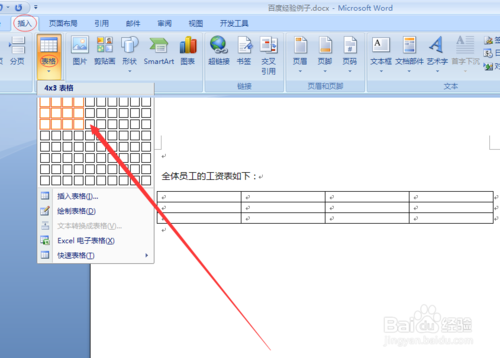1、首先看一下如何制作一张表格。在菜单栏中单击“插入”按钮,再单击一下“表格”会出现制作表格的几种方法。选择第一个“插入表格”,拖动鼠标,按照变红的区域选择所需要的行和列,例如3行4列,点击一下即可。