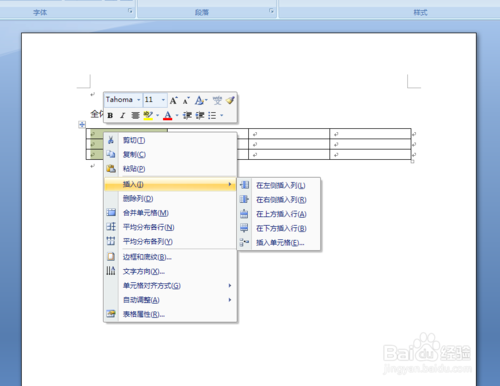 4、表格做好了,小编介绍一下表格格式的简单调整方法:随便选择一行或者一列表格(单独选择几个单元格也可以),点击右键,会出现很多选项,例如插入—行,列,单元格,删除列,合并单元格,平均分配行列等。