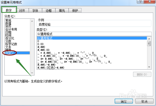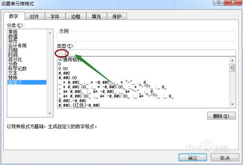 接着在设置单元格格式对话框数字下,我们点击"自定义",然后在类型下面的输入框里连续输入三个冒号或者分号";/:”