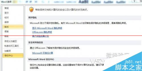 1、打开Word“文件“中的””选项“,选中“信任中心“;