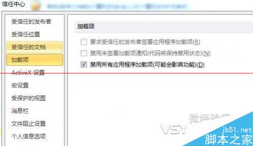 3、在“加载项”里选最后一个“禁用所有应用程序加载项”;