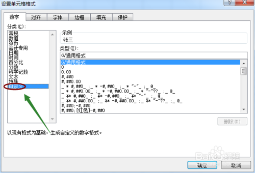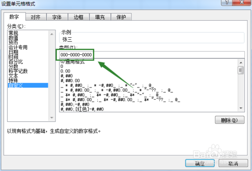 然后在数字的分类下,我们选择"自定义",然后将类型修改为"000-0000-0000"