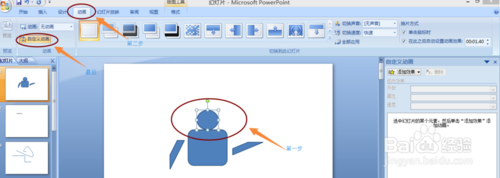 2、首先,打开PPT软件,选中一个你将要做动画的对象,然后点击左上角的“动画”,找到“自定义动画”这个选项。