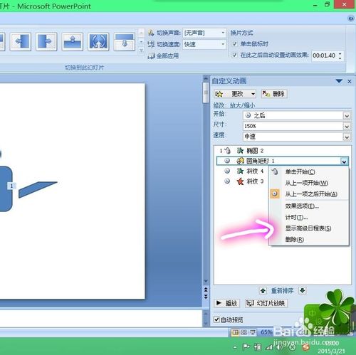 3、点击一下“自定义动画”后,右面就会出现一个窗口,添加了几个动画效果之后,就可以用动画轴来调整动画顺序了。