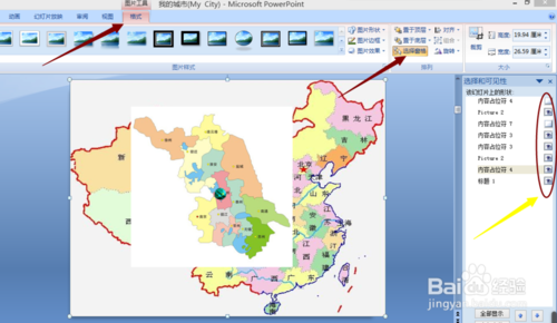 1、当一张幻灯片上要播放很多张图片时,这时你会发现很难控制其中一张图片,就是最简单的选中,调整一张图片都非常困难,如果不使用选择格窗将很难制作动画。下面小编就来教你如何使用选择格窗。