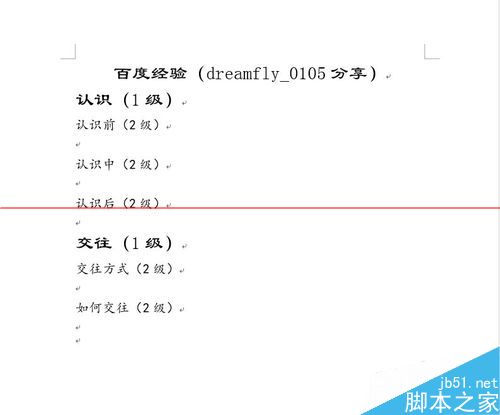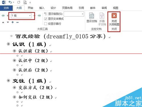 3、在大纲视图中,将文字中标注1级的设为“1级”,标注2级的设为“2级”,具体可以这样来操作:点击文字所在的行,让后再级别的位置选择就可以,例如“认识(1级)”,就可以点下这行,然后选择“1级”。全部设置完毕后,点击“关闭大纲视图”。
