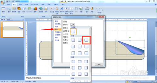 5、为我们上一步画好的多边形选择填充颜色。选成渐变色,制造阴影效果。然后在“阴影”中设置外部阴影为“左下斜偏移”。最后选定这两个多边形,选择“组合”,这样一来新颖的卷页效果就完成了。
