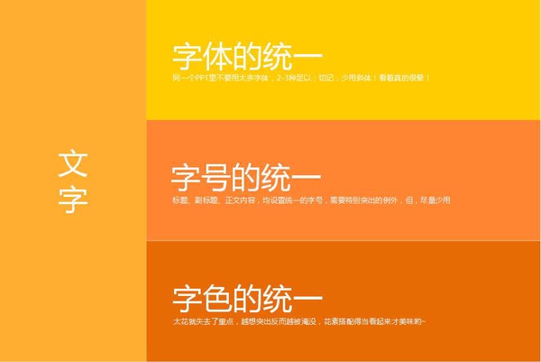 标题、副标题、正文内容,均设置统一的字号,需要特别突出的例外,但,尽量少用。