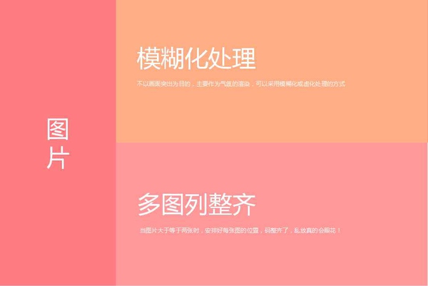 PPT里用到的图片主要分为两种:背景图、内容图(必要的插图、图表等),用来当做背景的图,为避免信息冗余,我们可以对其进行模糊化处理,从而突出文字信息。如果是内容图,单张的相对好处理,一旦图片数量多了不好好排列就会非常杂乱。